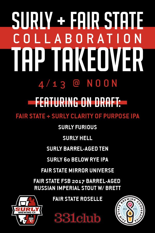 Come hang with Fair State and Surly at 331 Club on Friday, April 13th. They recently created Clarity Of Purpose IPA and will have plenty of other awesome stuff on tap too!